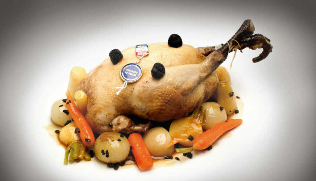 - Poularde de Bresse et ses nouveaux légumes, sauce crème, façon creampie